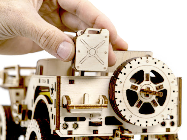 Precisie zonder Lijm Dankzij de laser-gesneden onderdelen van hoogwaardig, ecologisch berkenmultiplex, past alles perfect in elkaar zonder ook maar één druppel lijm. Het in elkaar zetten van de 4x4 is een meeslepende en zeer lonende uitdaging. De gedetailleerde handleiding leidt u door de montage van de 569 onderdelen.