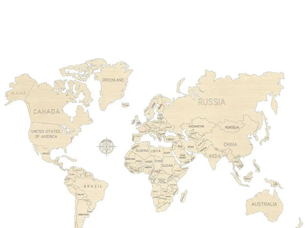 Indrukwekkend Formaat & Detail: Met een spanwijdte van maar liefst 83cm is deze kaart (Maat L) een ware blikvanger. Elk continent en land is met uiterste precisie lasergesneden, wat zorgt voor een verbluffend gedetailleerd en herkenbaar geheel.