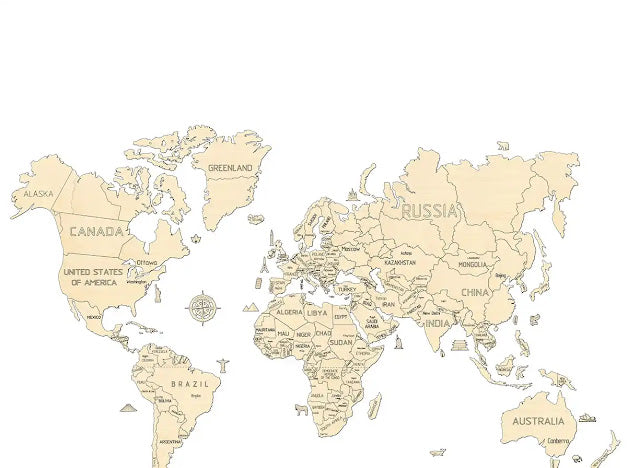 De warme, natuurlijke uitstraling van het hout geeft de kaart een tijdloos en elegant karakter. Elk continent en eiland is met uiterste precisie lasergesneden, wat zorgt voor een verbluffend gedetailleerd en geografisch herkenbaar resultaat.